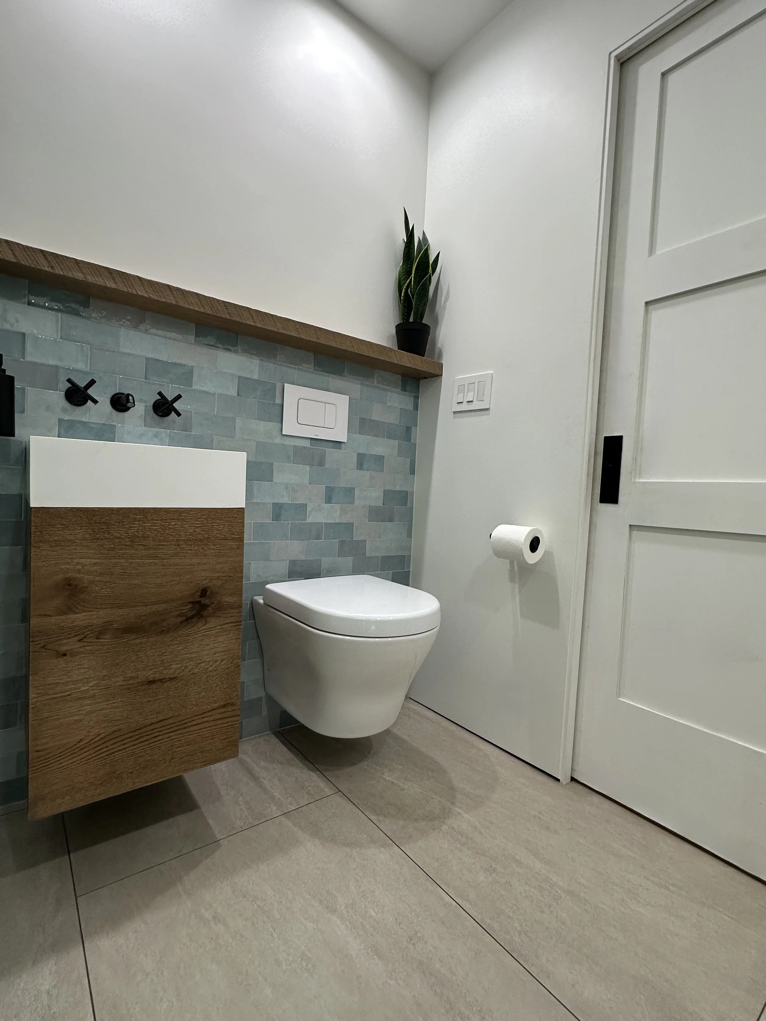 Balancing style and practicality, this contemporary den bathroom renovation was thoughtfully designed to serve both the poolside annex and the entertainment room. Featuring a modern wall-mounted toilet, a floating wood vanity with basin sink, and reeded glass sliding doors to allow in natural light while also maintaining privacy, this sleek wet-room layout maximizes functionality in a compact space.