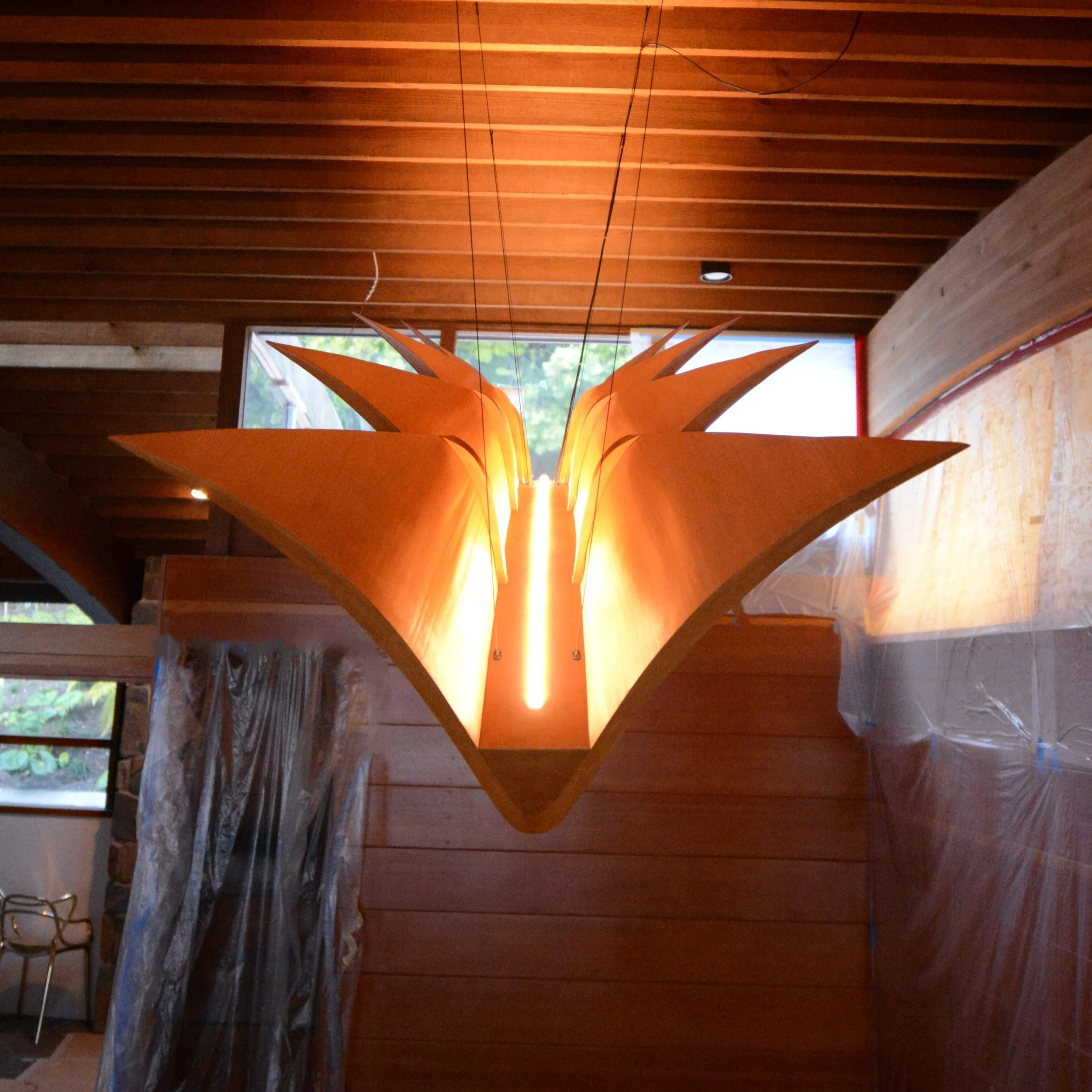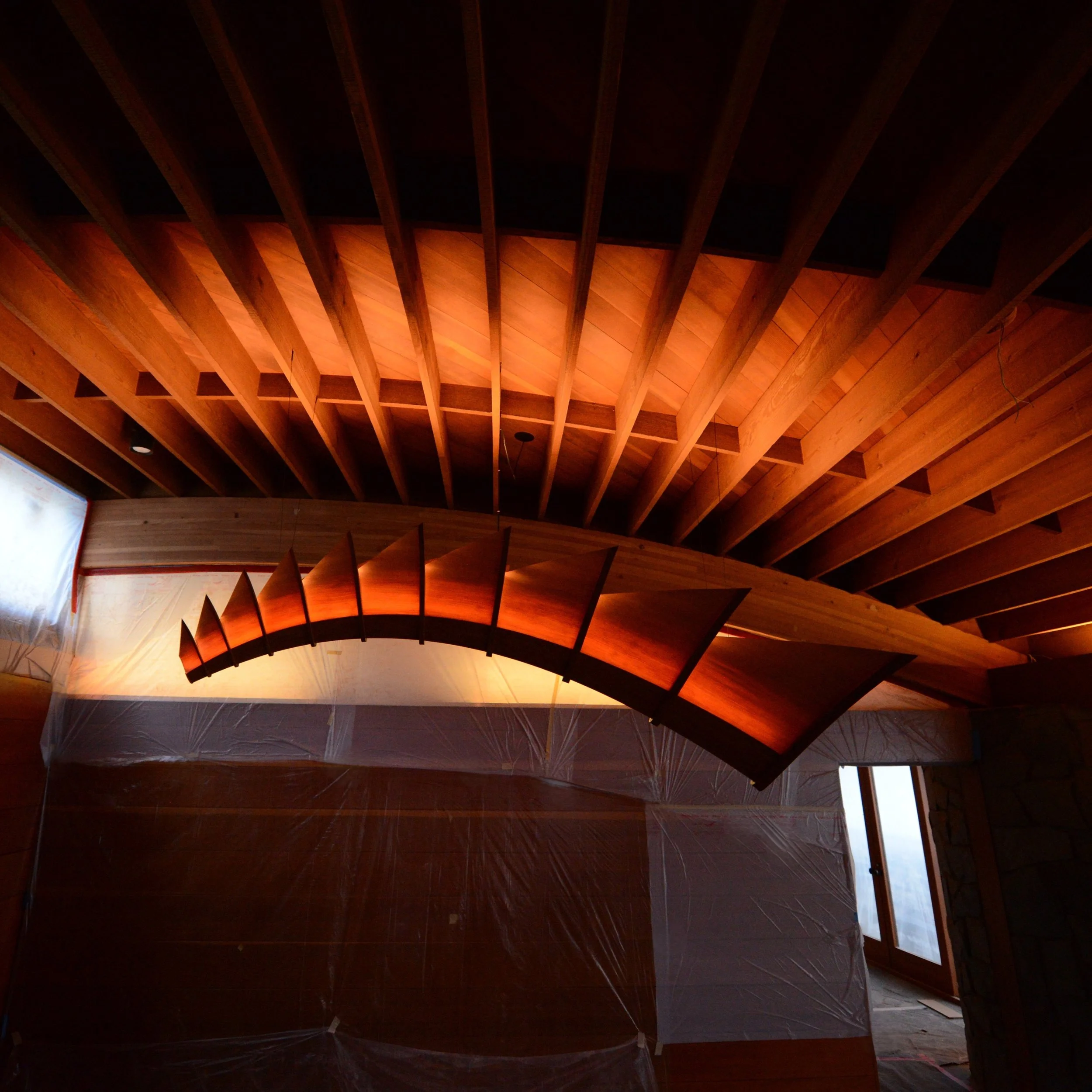 As part of the home’s meticulous restoration, this custom-designed chandelier was crafted to seamlessly integrate with the home’s original architectural character. Selecting materials drawn from the initial build the installation emulates radius geometric forms that echoes the sweeping curved beams seen throughout the entire home. As a defining centerpiece, it honors the visionary design of renowned architect John Lautner.