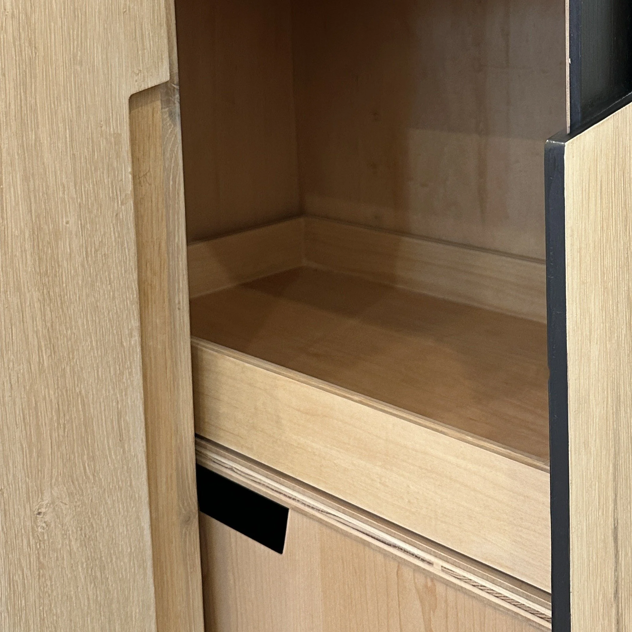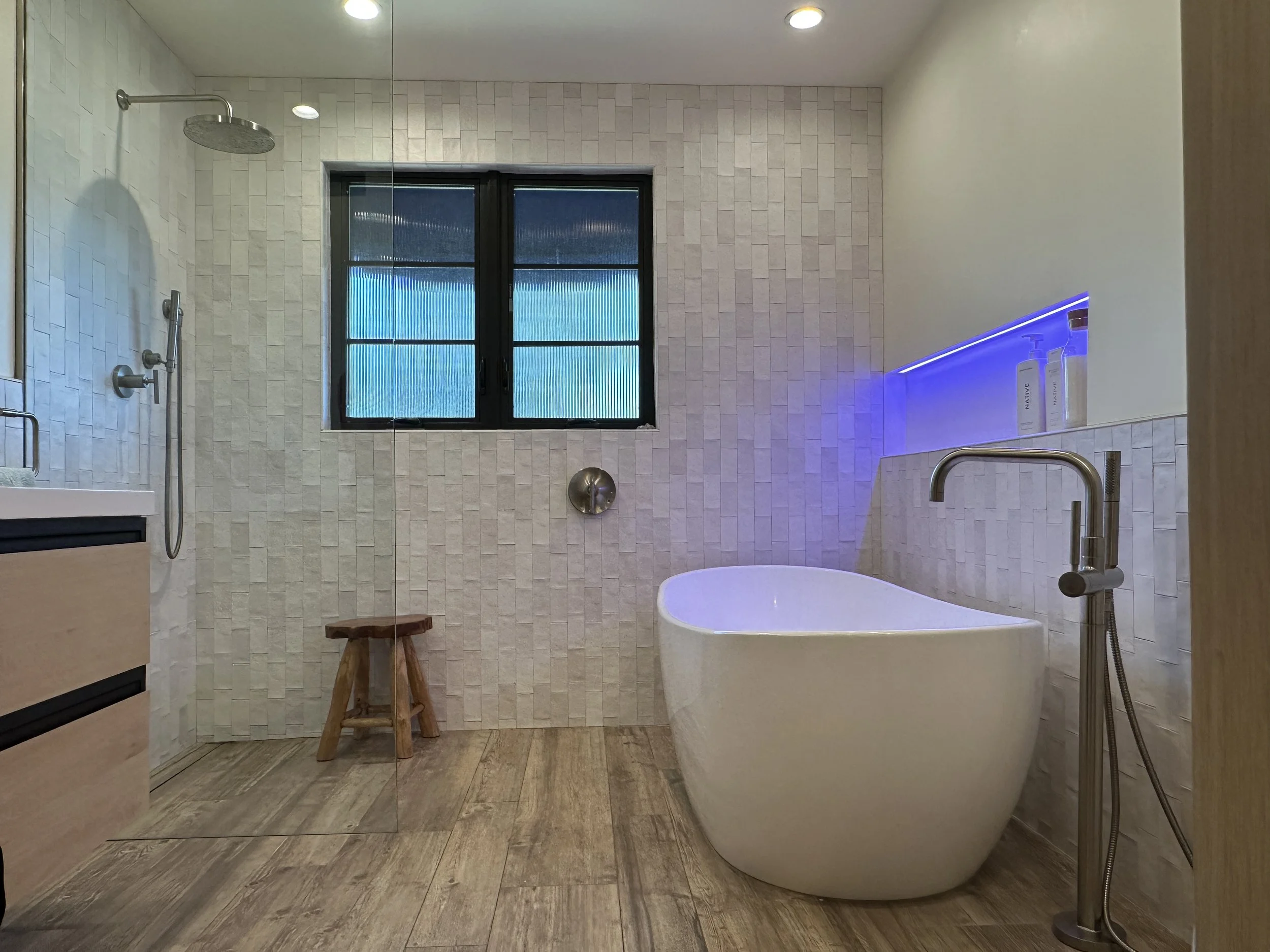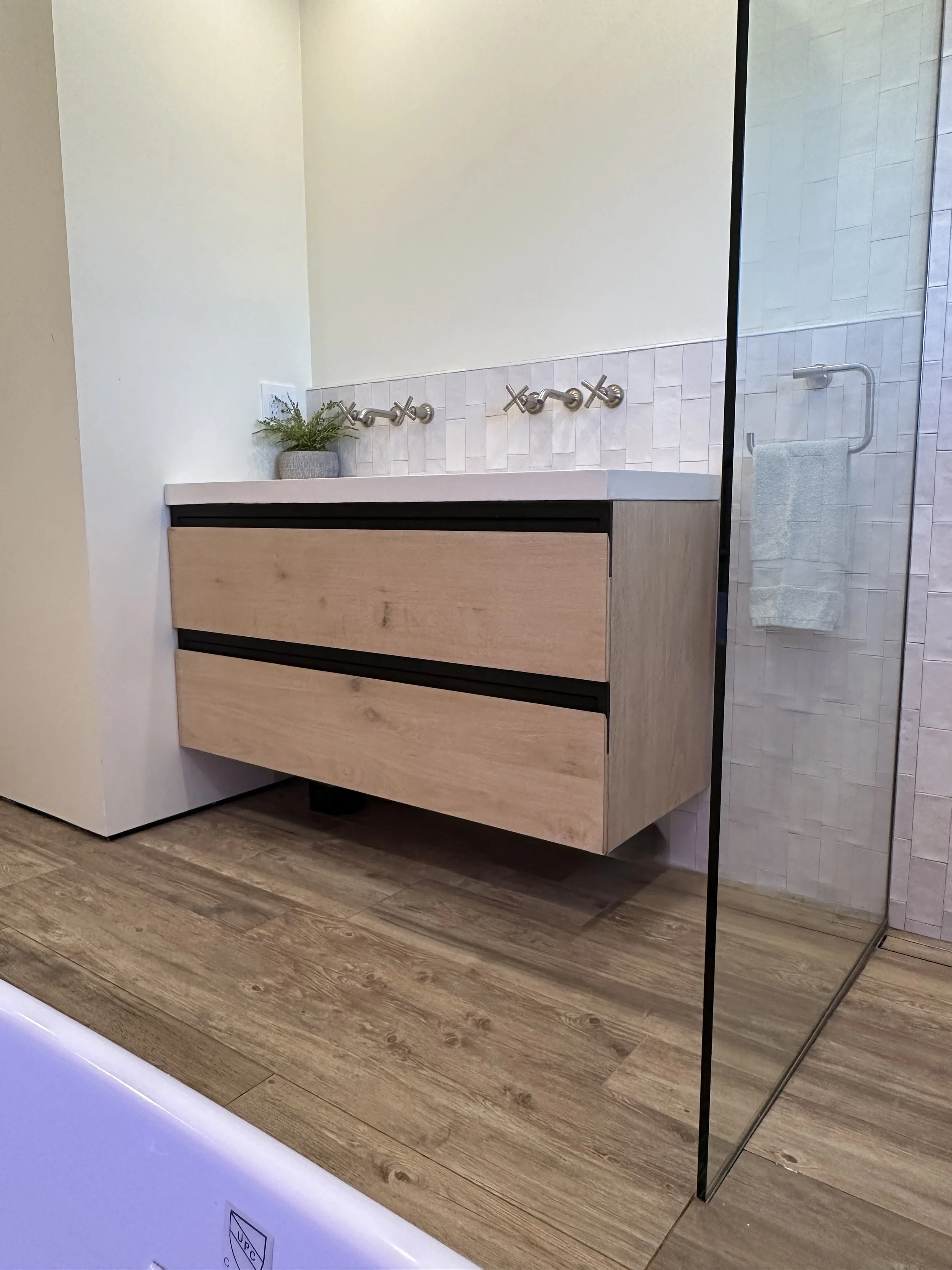 This guest bathroom remodel is based in a traditional California ranch-style that bridges classic charm with contemporary elements. Hand-glazed Moroccan tiles add depth and softness, complemented by wide-plank porcelain flooring that mimics natural wood. The walk-in shower features minimalist glass, a linear drain, and a rain-style fixture, balancing utility with elegance. A floating oak vanity and matching bespoke millwork bring cohesion and organic warmth while concealing ADA-compliant elements, ensuring accessibility without compromising aesthetics and design.